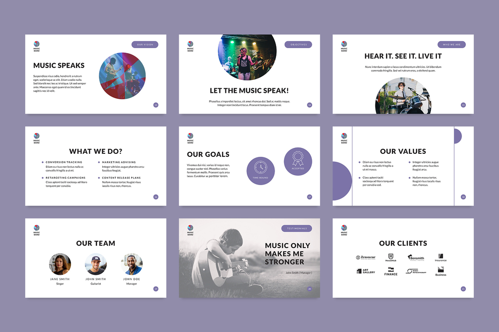 A dynamic and creative PowerPoint template designed for music bands, artists, and live events.