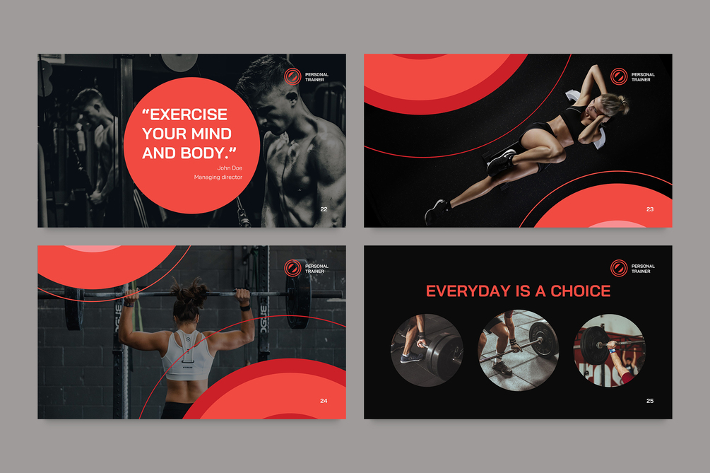 A strong and dynamic PowerPoint template designed for personal trainers, fitness coaches, and gym professionals.